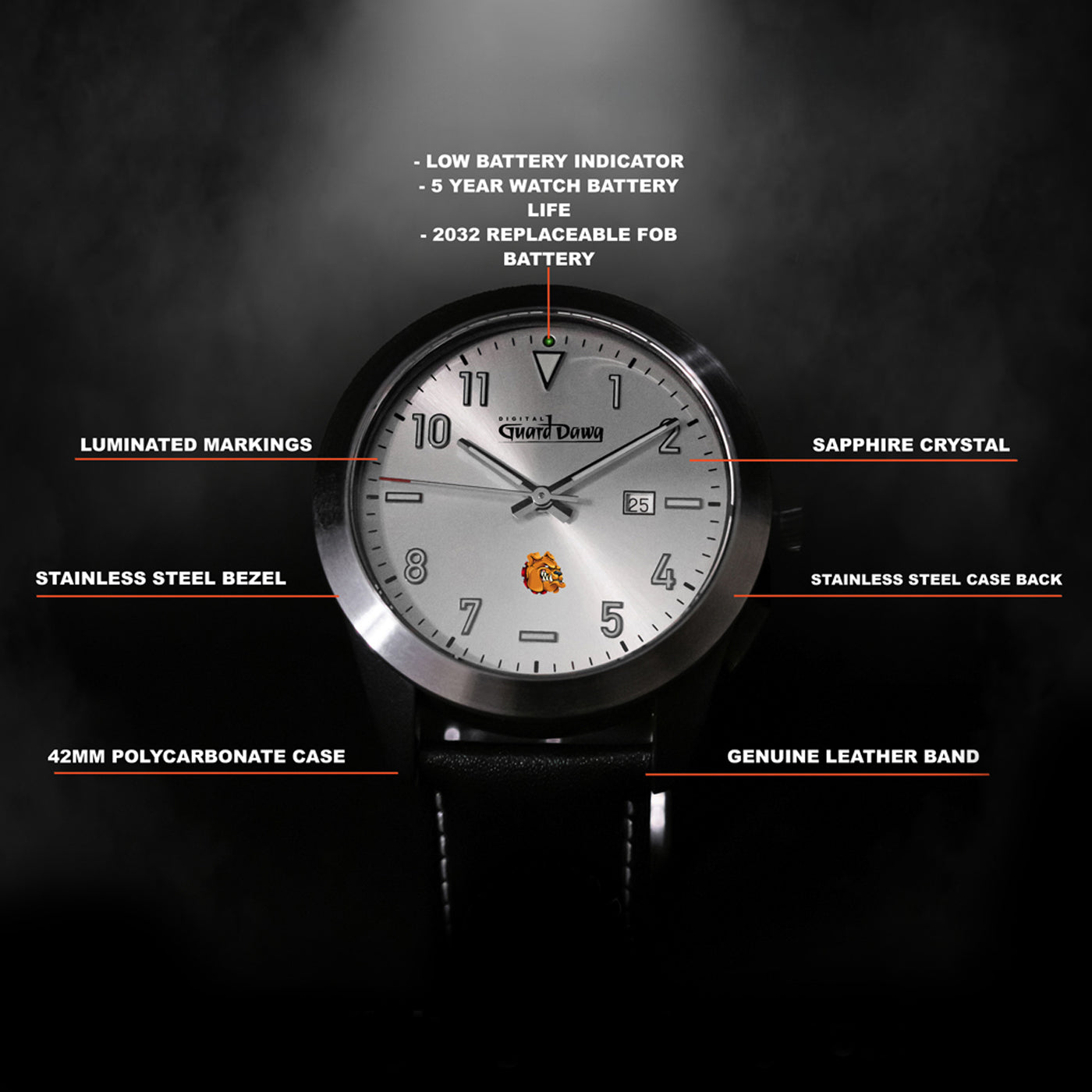 The watch comes in two trims. You can opt for the sleek black dial or the classic silver dial. With a 42mm, very light weight Polycarbonate case and genuine leather band, you will enjoy wearing your wearable tech watch. This luxury watch fob can also be custom designed to add your company logo. To learn how, contact us today!